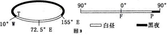 5、单选题 图3中左图为某日某时刻30°N纬度线,右图为72.5°E经线的昼夜分布状况,据图3中信息回答题。
