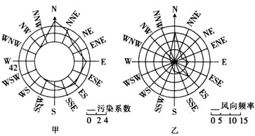 4、单选题 目前我国一般用污染系数(污染系数=风向频率/平均风速)来定量反映风对大气污染的影响。下图为我国M城市多年污染系数分布图(甲)和多年风向频率统计图(乙),回答1~2题。