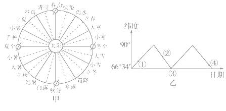 2、单选题 我国古代人民根据日月运行位置和天气及动植物生长等自然现象,把一年平分为二十四等份,这就是二十四节气(如图甲),二十四节气能反映季节的变化,指导农事活动。图乙是北半球晨昏线与纬线的切点变化示意图。读图完成下列各题。