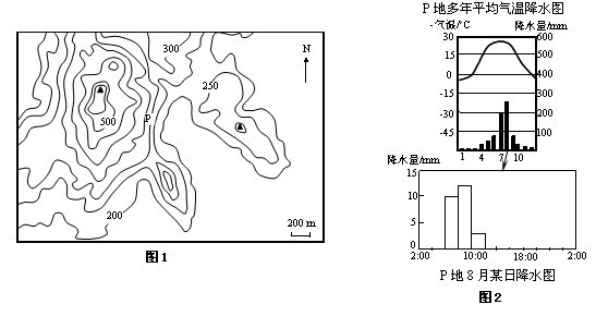 5、单选题 下图1、图2分别是我国某地地形图和气温降水图,读图完成问题。