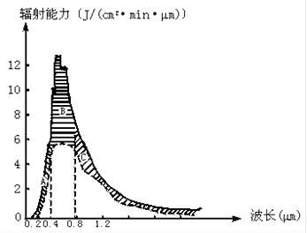 4、单选题 下图是近地面(虚线)和大气上界(实线)太阳辐射波长分布示意图。读图回答下列各题。