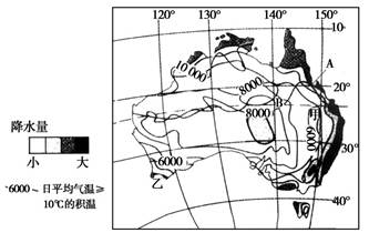 4、单选题 读“澳大利亚≥10℃积温(单位:℃)及年降水量(单位:mm)分布图”,回答下列各题。