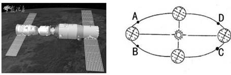 小题2:九号和天宫一号对接时地球在公转轨道上的位置最接近于上面右图中的: