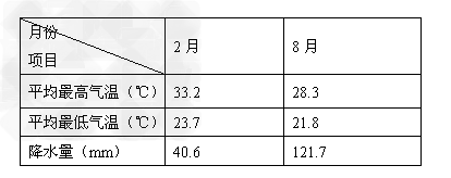 参考答案:(1 )降水8 月多,气温8 月份低。8 月份受赤道低压、西南风以及暖流的影响,降水多;2 月份受东北风的影响,降水少。8 月份降水多、云量多,大气对太阳辐射的削弱作用强,气温低。