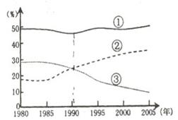 2、单选题 该图为我国东部某省三大产业产值比重变化图。读图回答问题。