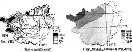 广西于2009年8月至2010年4月发生了旱灾。旱情分布见图乙。