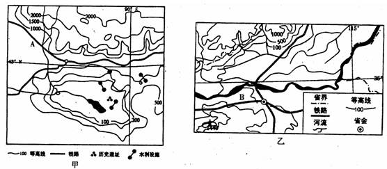 ⑵、甲图所示地区地势北高南低、大致以铁路线为界分为两部分,北侧为山地,南侧为盆地(2分);乙图所示地区地势西高东低,大致以南北向铁路线为界分两部分,西侧为山地(高原),东侧为平原(2分)。