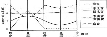 3、单选题 图3 是30°N地区几种朝向的窗户内每天可能受到阳光直接照射的时间曲线图.读图3,请回答
