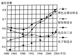 1、单选题 下图是我国不同产业地理集中程度变化趋势统计图(基尼系数数值越高,表明地理集中程度或专业化程度越高),读图回答1~2题