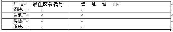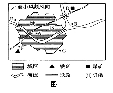 3、综合题 图4所示城镇拟在A、B、C、D、E、F六处选址建钢铁厂、造纸厂、啤酒厂和服装厂。读图并根据所学知识,进行合理的工业区位选择,填写下表。(12分)