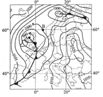1、单选题 下图是欧洲部分地区某月15日14: 00海平面等压线分布图,左侧气压中心自A处向东北方向移动。读图完成以下问题。