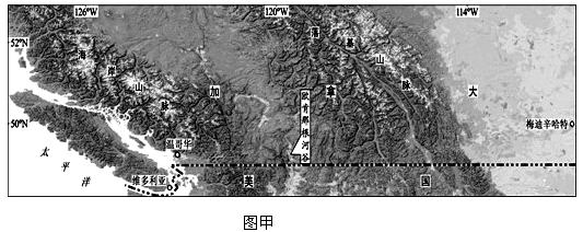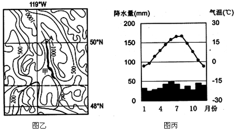材料一:图甲为加拿大国西南部地区地形图,图乙为欧肯那根河谷等高线地形图,图丙为甲湖湖畔A市的气温降水图。