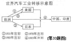 4、综合题 (10分)当丰田汽车正在向世界第一个年产千万辆汽车企业的目标迈进时,底特律上空正被上亿美元的亏损和裁员的阴云所笼罩;随着日本汽车企业和欧美汽车厂实力的此消彼长,世界汽车产业制造中心正向亚洲转移.读题33"世界汽车工业转移"示意图,完成下列各题.