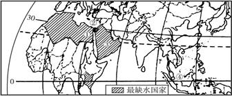 (1)世界上最缺水国家中,绝大部分地区的气候特点是 。其原因主要是 _。全世界有许多地区因水而引发冲突,其中最典型的是_ 地区。
