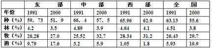 1.表中三个地带,农业构成差异最大的部门是:2.20世纪90年代以来,三个地带农业部门比重一直下降的是:3.造成三个地带农业部门差异主要自然区位因素是: