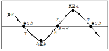 2、单选题 在地球公转过程中,若以地球为参照系,可看到太阳在黄道上运行。下图是太阳在黄道上的视运行轨迹图,完成以下问题。