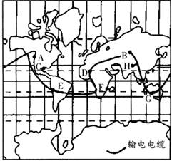 太阳能发电是全球各国非常重视的研究项目。为了充分利用全球的太阳能资源,科学家设想,把全球太阳能电站联成网络(图中A、B、C、D、E、F、G、H为世界上一些太阳能资源丰富地区),以便在昼夜半球之间调节太阳能的余缺。