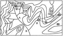 1.甲图为某山区等高线地形图(单位:米),该区多岩崩和泥石流等地质灾害。图中四地最易发生泥石流的是2.乙图为甲图中某地部分等高线,实线为等高线(单位:米),虚线为泥石流行进路线。某游客恰好处在O点,其正确的逃生方向是
