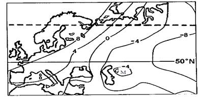 1、单选题 气温距平(单位:℃)是指某地气温与同纬度平均气温之差。读“亚欧大陆部分地区某季节等气温等距平线图”,回答8—10题。