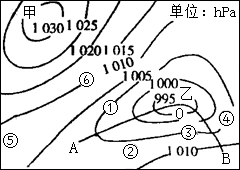 4、单选题 下图是某日08时和20时海平面气压分布图(单位:百帕)。读图,回答问题。