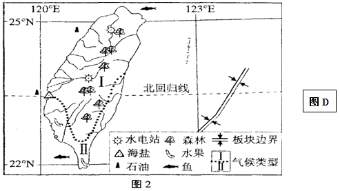 (5)图D中该岛的气候类型Ⅰ为__ __ __气候,Ⅱ为___  _气候。两种气候类型的界线向南弯曲,主要是______的缘故。与同纬度大陆相比,该岛的气候具有较显著的海洋性特征,气温年较差___,降水丰沛。(4分)