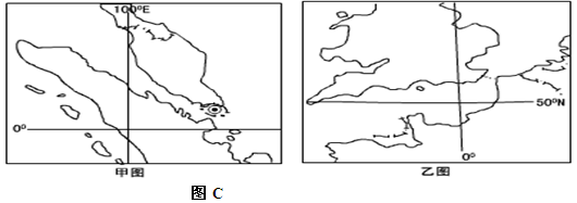 (4)图C甲、乙两图为世界著名海峡的地理简图,读图回答:   图所示海峡往往风浪较小,因为该海峡位于                 带(气压带风带全称);  图所示海峡往往风大浪高,因为该海峡位于               带(气压带风带全称)。(4分)