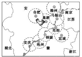 4、综合题 2011年6月17日,由安徽省教育厅、科技厅、经信委和巢湖市政府共同主办的第三届皖江城市带承接产业转移示范区产学研对接会在巢湖市召开。“皖江城市带承接产业转移示范区”(如下图)的成立,将参与泛长三角区域发展分工,承接沿海地区产业转移。读图,回答问题