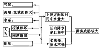 (1)某地理兴趣小组为探究图示区域每年防洪压力较大的原因,绘制了下面框架图,请帮助他们完成。