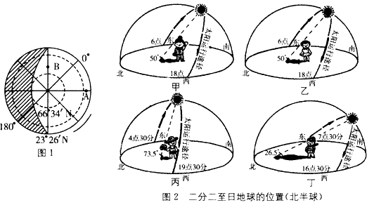 (2)图1所示为北半球_________(节气)。此时,地球位于图2中的__________位置附近, 公转速度