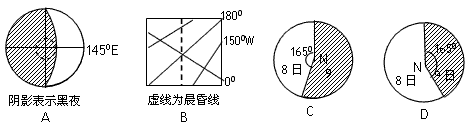 4、单选题 下列四幅图中与太平洋标准时间(西八区)6月8日15时的情况相吻合的是