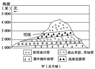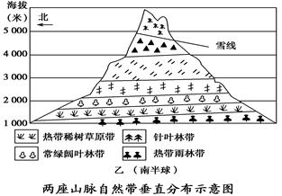 (1)比较甲图和乙图山脉自然带带谱的主要差异,并判断哪幅图的山脉所处纬度位置较低。(8分)