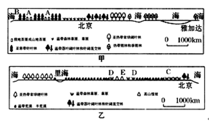 1、单选题 下面两幅图中,甲图为“从雅加达到北京附近沿经线的植被分布示意图”,乙图为“经北京附近沿纬线的植被分布示意图”。读图回答问题。