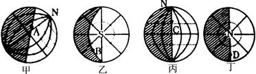 1、单选题 读图,下面四幅图,在A.B.C.D四点中,处于黄昏的是: ( )