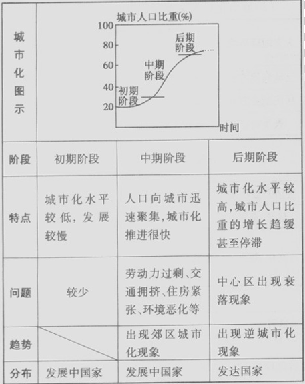 产业革命前缓慢——产业革命后加速发展(20世纪尤其是二次世界大战后速度空前,城市人口比重迅速上升。大城市发展速度超过小城镇、数目增多;人口规模迅速膨胀。)