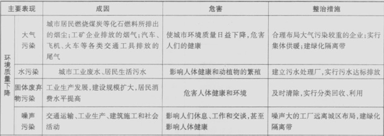 考点名称:城市环境问题及治理措施常见城市化环境问题的表现、成因、危害及整治措施: