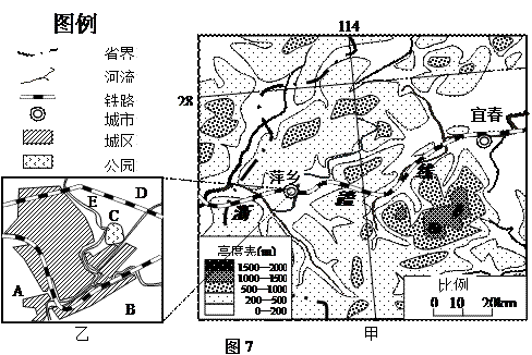 3、综合题 萍乡工业以1898年安源煤矿的开办为标志,属我国最老的工矿城市之一。读下图(图7)与资料,回答下列问题: