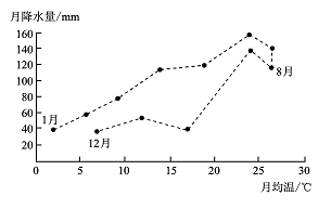 1.图中所示城市可能是2.该地7、8月份气温最高,降水量6月最多,原因可能是