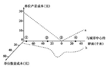 小题1:读图,市中心应是中心商务区。当与市中心距离为0时,单位产品成本为0,说明a是运输费用,在市中心生产,运输成本为0。b曲线在市中心单位数量成本最高,市中心地租最高,所以只能是土地成本高。所以A对。B错。科技成本高低与距市中心远近无关,C、D错。