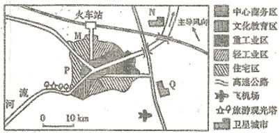小题2:石油化工污染大气,适合建筑主导风向的下风向,河流的下游,为N;高级住宅区适合布局在主导风向的上风向,与旅游观光区较近,为P。所以本题选择D选项。