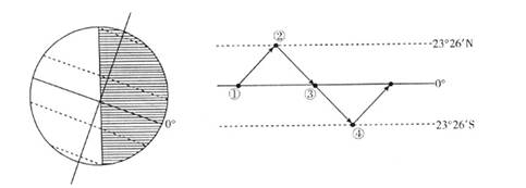3、单选题 读“某日昼夜半球示意图”和“太阳直射点移动示意图”,回答下列问题。(10分)