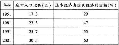 表1:1951~2001年印度城市人口与城市经济的发展(单位:%)