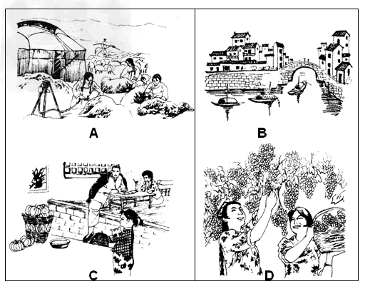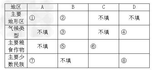4、综合题 读我国A~D 四个地区的景观图,在表中①~ ⑩数码处填写相关内容。