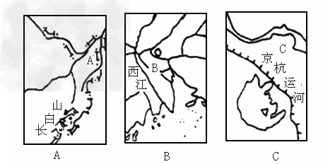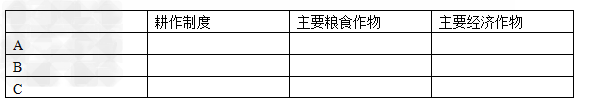 2、综合题 图中A、B、C三地为我国重要的商品粮基地,比较A、B、C三地差异,填写下表。