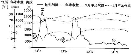 3、单选题 下图是“沿106.5°E经线的地形剖面及相关气候资料图”,据图回答下列问题。