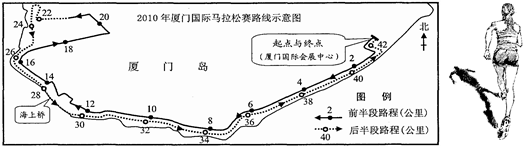 1、单选题 经国家体育总局批准,2010年厦门(北纬24°27′,东经118°06′)国际马拉松赛事于北京时间1月2日上午8点鸣枪开赛。下图为2010年厦门国际马拉松赛路线示意图和某女运动员比赛过程即时素描图。当该女运动员到达全程赛事终点时,她的身影向正北并大致与身高相等。结合下图回答下列各题。