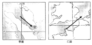 (4)在图中海峡范围内用箭头方向线标出:(1)甲图标出来自世界最大石油产地的原油运输方向;(2)乙图标出来自附近著名洋流方向。(2分)