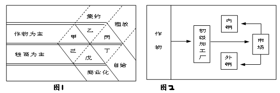 1、单选题 图1表示甲至己六种农业类型的经营特色,图2示意某种农业的活动模式,读图完成小题。