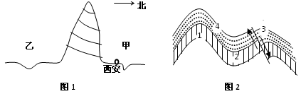 1.图1中甲地地形形成原因从地质构造上看属于图2中的2.图1中山脉是我国一条重要的地理分界线,有关图中山脉两侧叙述正确的是3.图1中山脉的遂道有“中国第一长遂”之称,从地质构造来看打遂道最好选图2中的