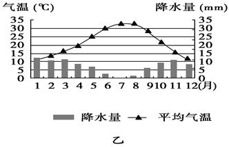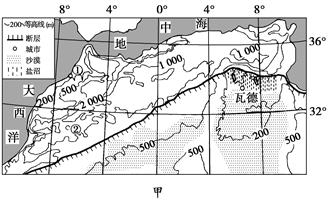 4、综合题 古代阿拉伯人把今突尼斯、阿尔及利亚和摩洛哥所在地区统称为马格里布地区。甲图为马格里布地区示意图,乙图为该地区瓦德市的气候资料统计图,下表为甲图中①②两城市各月平均日照时数表(单位:小时)。据此回答下列问题。(25分)