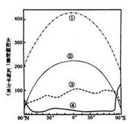 3、单选题 读到达地球太阳辐射量的分布图,图中曲线分别表示地表吸收太阳辐射量、地表反射太阳辐射量、大气上界太阳辐射量、云层反射太阳辐射量。回答下面问题。